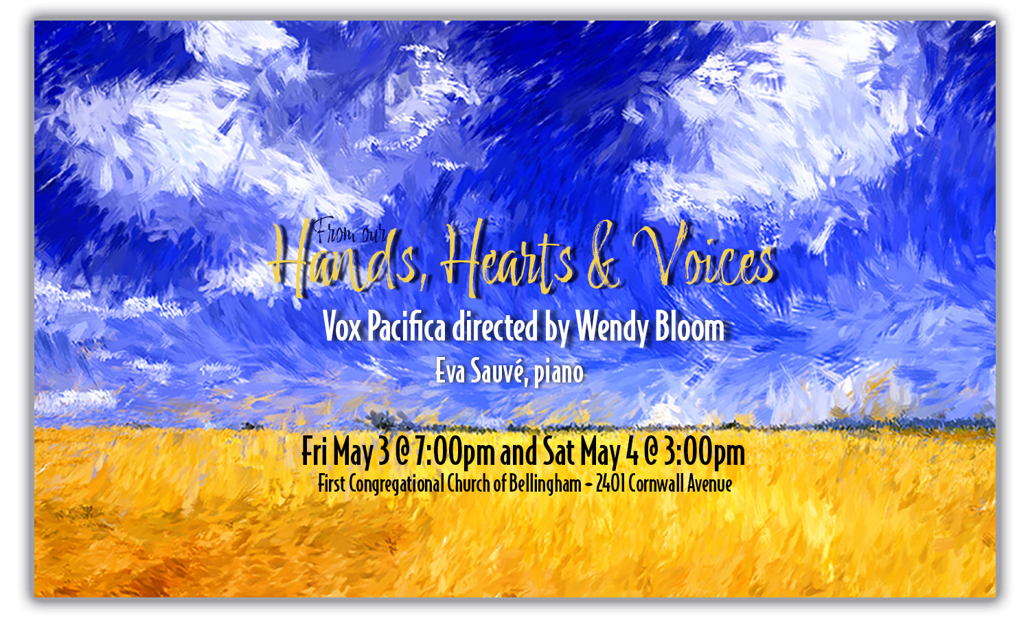 Through the simple act of opening ourselves to others, we can often provide comfort, healing, and hope. Vox Pacifica’s spring performance will explore these connections through song. This upbeat program will include Sara Bareilles’ Kaleidoscope Heart and Sing! by Pentatonix, both featuring energetic body percussion. Stephanie Straight will join us on djembe and vibraphone. James Mulholland’s luscious Heart, We Will Forget Him is set to the poetry of Emily Dickinson. It features a horn collaboration with Jane Aspnes that will certainly fill your hearts.