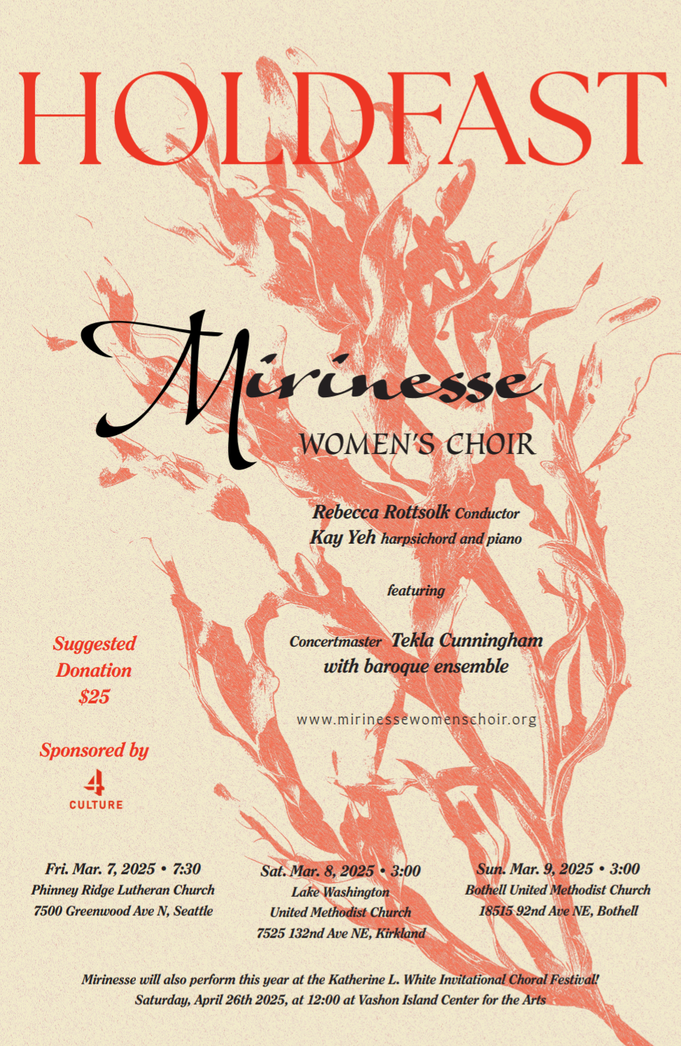For our 2025 concert season, we open with a period performance of Vivaldi’s Gloria – written for the women of the Venetian Ospedali where Vivaldi served as music director. We are excited to be joined by concertmaster, Tekla Cunningham, founder of the Whidbey Island Music Festival and the new Seattle Bach Festival. Tekla has secured an all-female ensemble of Baroque style experts to perform with Mirinesse. We are thrilled to perform this work in its original setting.