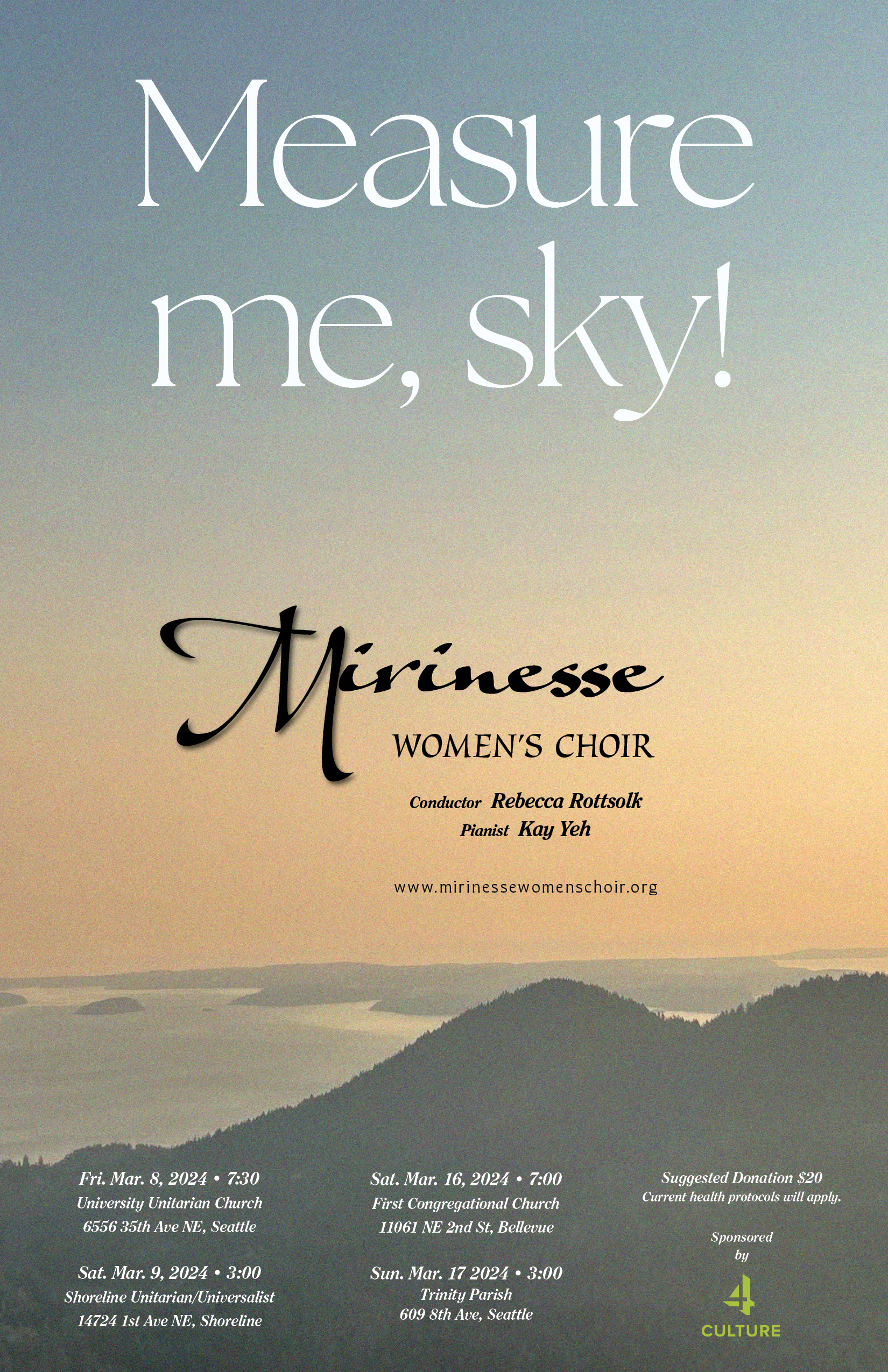 The 2024 Mirinesse program, Measure Me, Sky!, was inspired by the Sara Teasdale poem, “Leaves”, which is set for a cappella double choir in “Blinded By a Leafy Crown” in our program. “…But the little leaves that die have left me room to see the sky; Now for the first time I know Stars above and earth below.“ This called forth wonderful earth and stars repertoire choices for us; a walking, meandering and biking journey on earth and looking up and seeing the stars, “I know I am honored to be witness of so much majesty.”